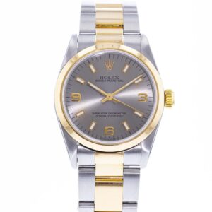 The Oyster Perpetual design has been a fan favorite for decades because of its classic design. Here we have a ref. 67483 from the 1990s – a model with a thinner profile, including a flatter, two-tone riveted Oyster bracelet that was clearly meant as a more subtle and elegant alternative to other bracelets Rolex was producing at the time.