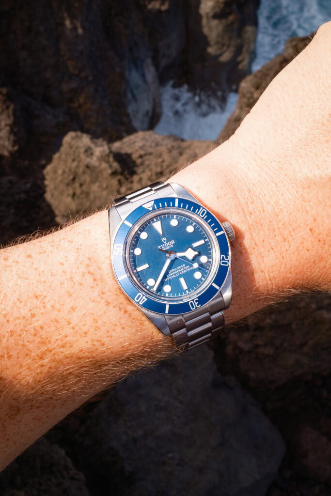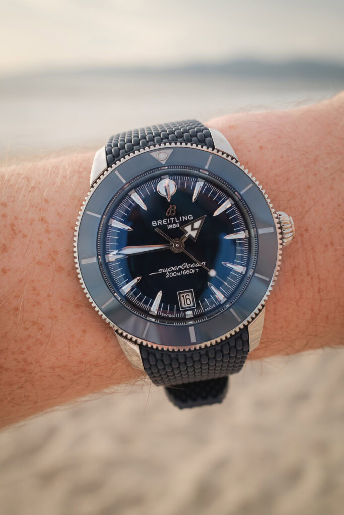 The Breitling Superocean’s sunburst dial catches the light with an almost liquid shimmer, an effect amplified on Slater’s leaf-print edition, although the ceramic bezel dulls some of that romance. It’s a beautiful watch, evocative of a certain midcentury nostalgia that’s not uncommon in surfing. Still, for all its onion crown and broad-arrow hands, the watch feels less like a piece of equipment you’d be comfortable banging on a fiberglass board. Having paddled out (in much smaller waves) with my Black Bay 58, I can confirm having a steel watch on your wrist is an excellent way to feel self-conscious—and worried about your rails.
