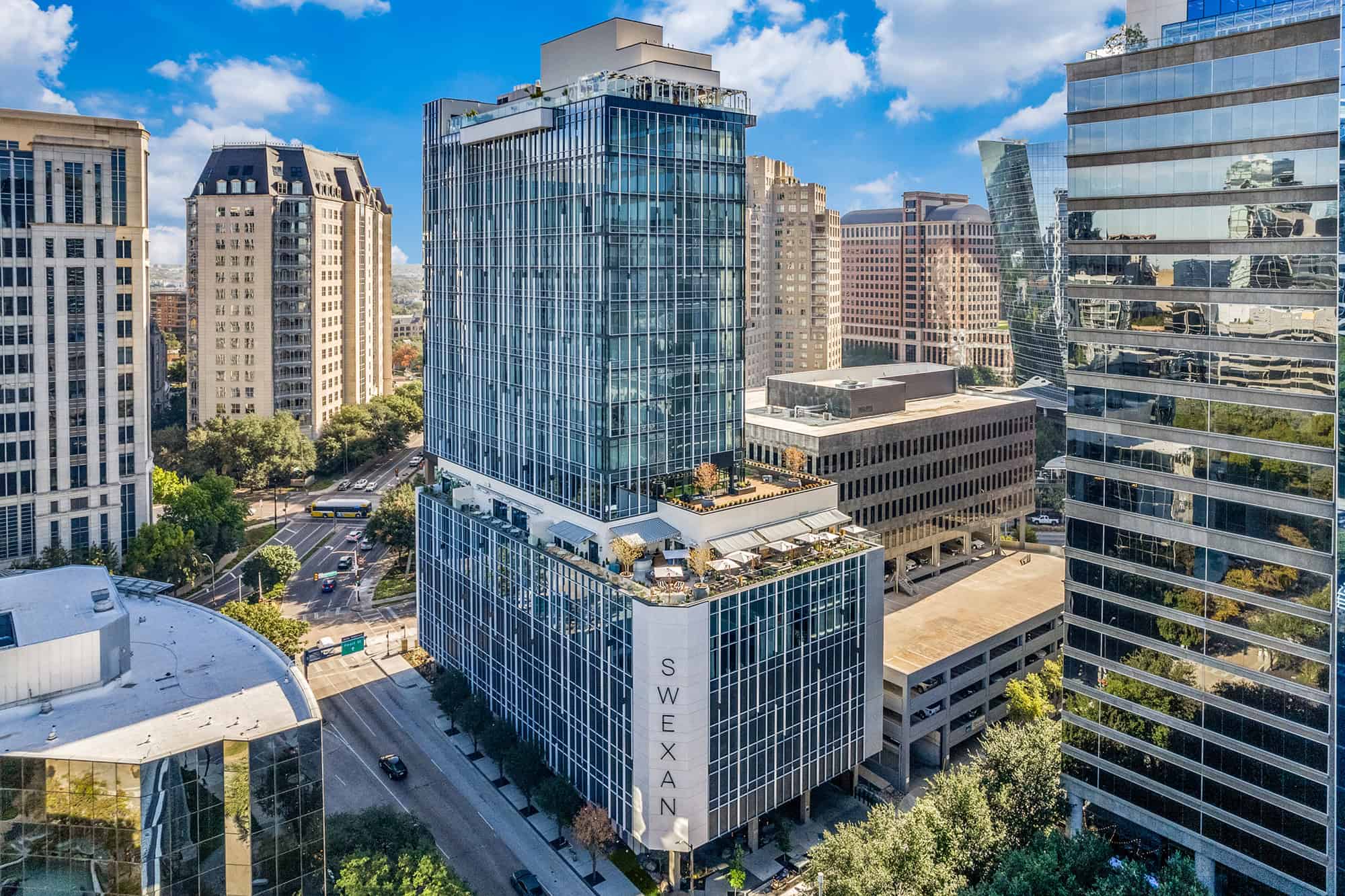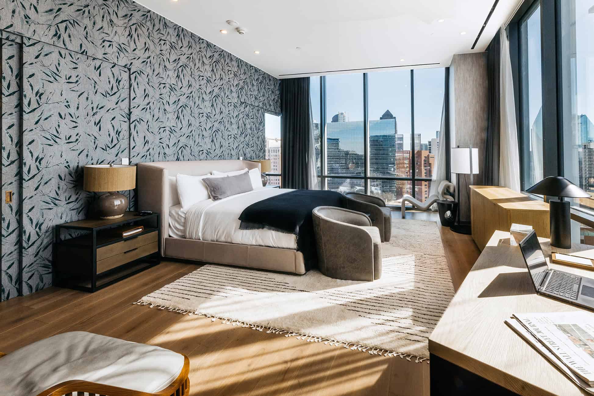 Tucked into the heart of Dallas’ buzzy Harwood District, Hôtel Swexan (“Swiss meets Texan”) is a sleek new property that’s already become a magnet for in-the-know travelers and locals alike thanks to its Kengo Kuma-designed minimalist exterior (the Swiss bit) and the diametrically opposed dramatic interiors; think Italian marble, herringbone wood floors, and vintage Murano lighting (the Texas bit). Part of the family-owned Harwood District, a 19 block sprawl in Dallas’ Uptown neighborhood, the hotel echoes the multi-generational Swiss-Texan heritage.