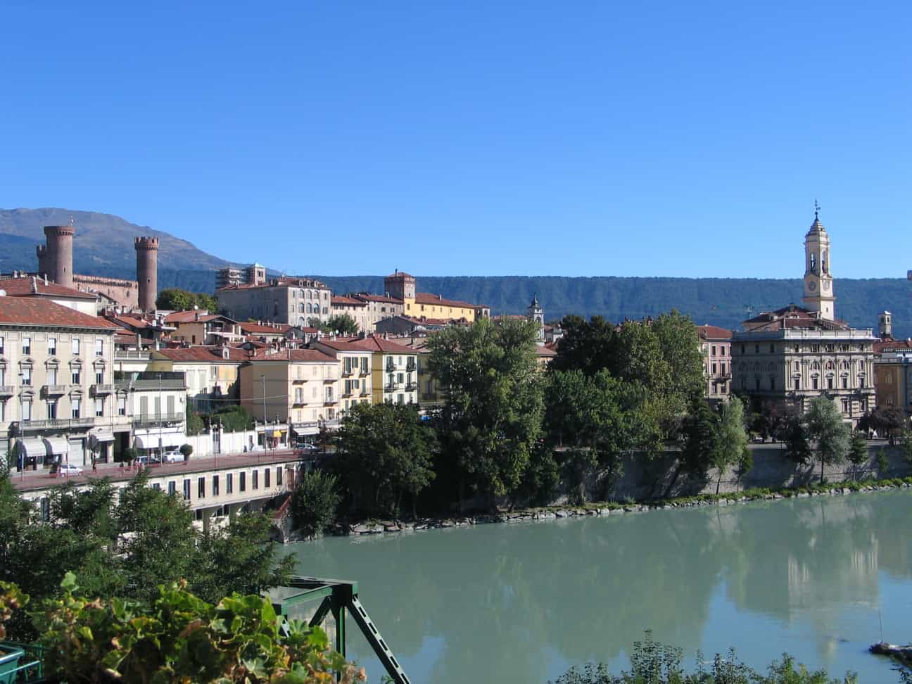 The center of town is a picturesque blend of medieval architecture and 20th-century buildings, with narrow streets and striking squares. The Dora Baltea River cuts through town, its waters thrumming powerfully (industriously, one could say) under Ivrea’s impressive bridges, old and new. In winter, visitors come from all over to take part in the Carnival of Ivrea, making for Italy’s largest food fight, as teams in historical garb pelt each other with gusto in an all-out “Battle of the Oranges.”