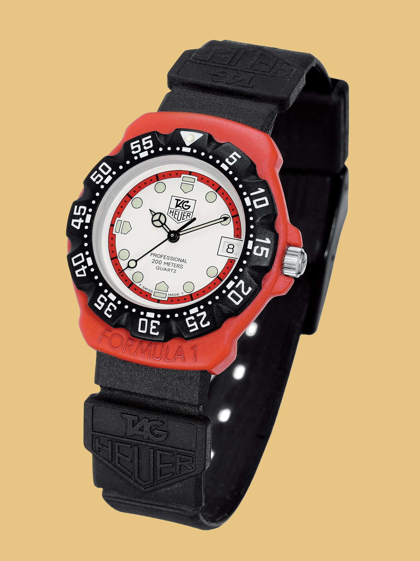 The watch, a first-generation Formula 1 watch, designed by Eddy Burgener, features a red fiberglass case with a black plastic strap that was sized by cutting off the end.