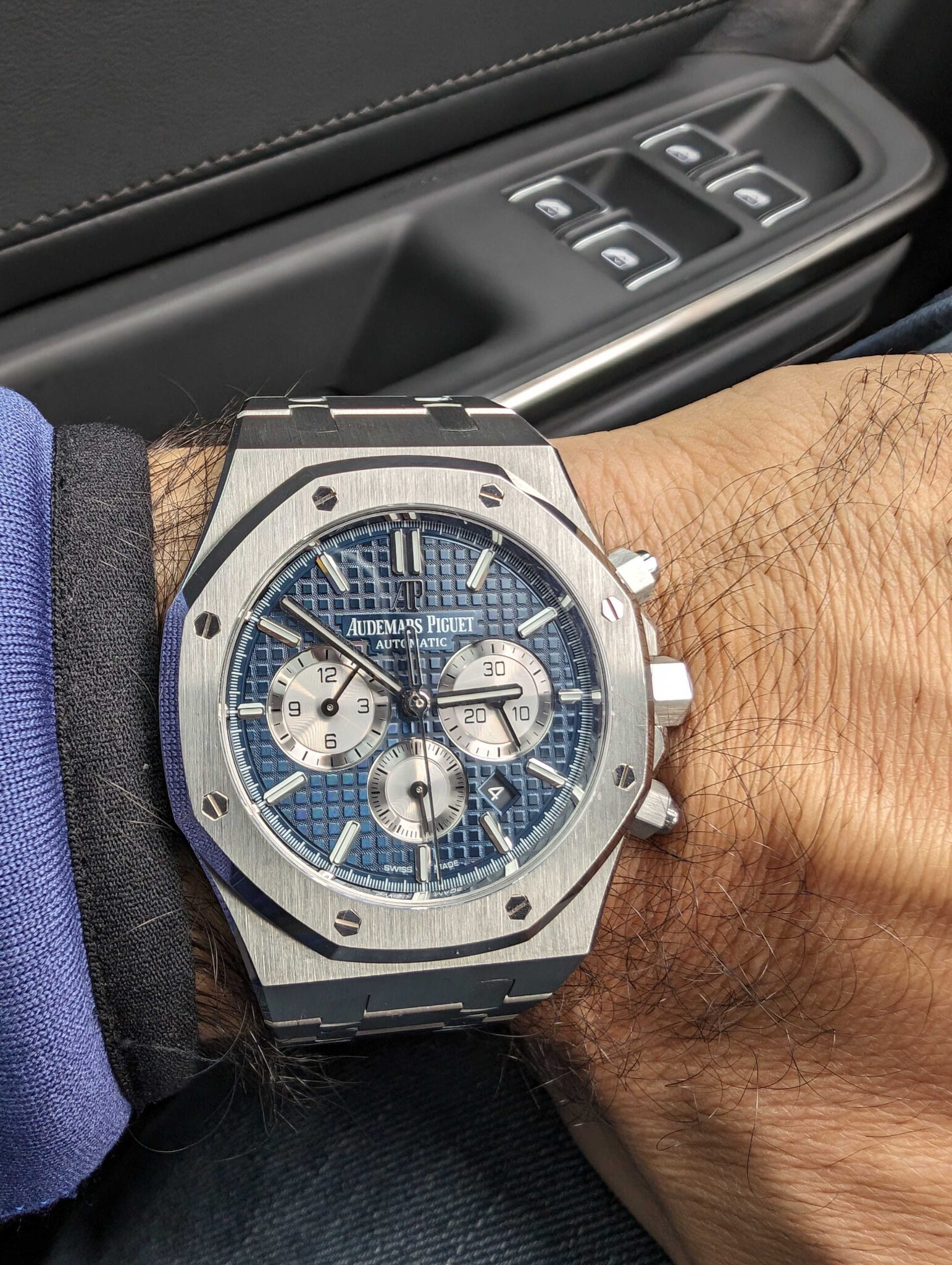 The Audemars Piguet Royal Oak chronograph, ref. 26331ST, is one of the most sought-after Royal Oaks on the secondary market. The 41mm stainless steel chronograph with its blue Grande Tapisserie dial and contrasting rhodium-toned sub-dials routinely trades above $40,000, according to WatchCharts. Jeff Hammoud, Rivian’s Chief Design Officer, bought one to wear on one of the most significant days of his professional life.