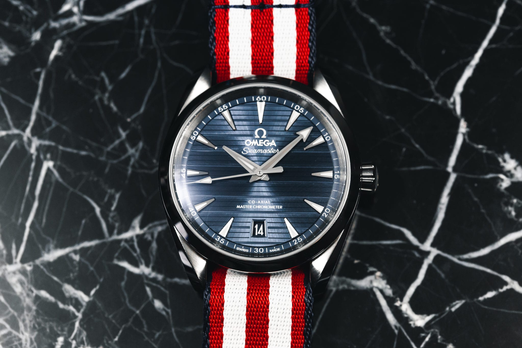 We’re thrilled to offer one of these authentic Omega timepieces previously owned by one of these remarkable skeleton athletes. The Aqua Terra 150M is a METAS certified chronometer powered by the brand’s Master Chronometer Caliber 8900. It features a stainless steel construction with a modern, oversized 41mm case. The model comes equipped with a nylon strap in classic red, white, and blue. This perfectly complements the handsome blue teak dial, which showcases a date window at the six-o’clock position. You can own a piece of Olympic history with this special timepiece. Happy shopping!