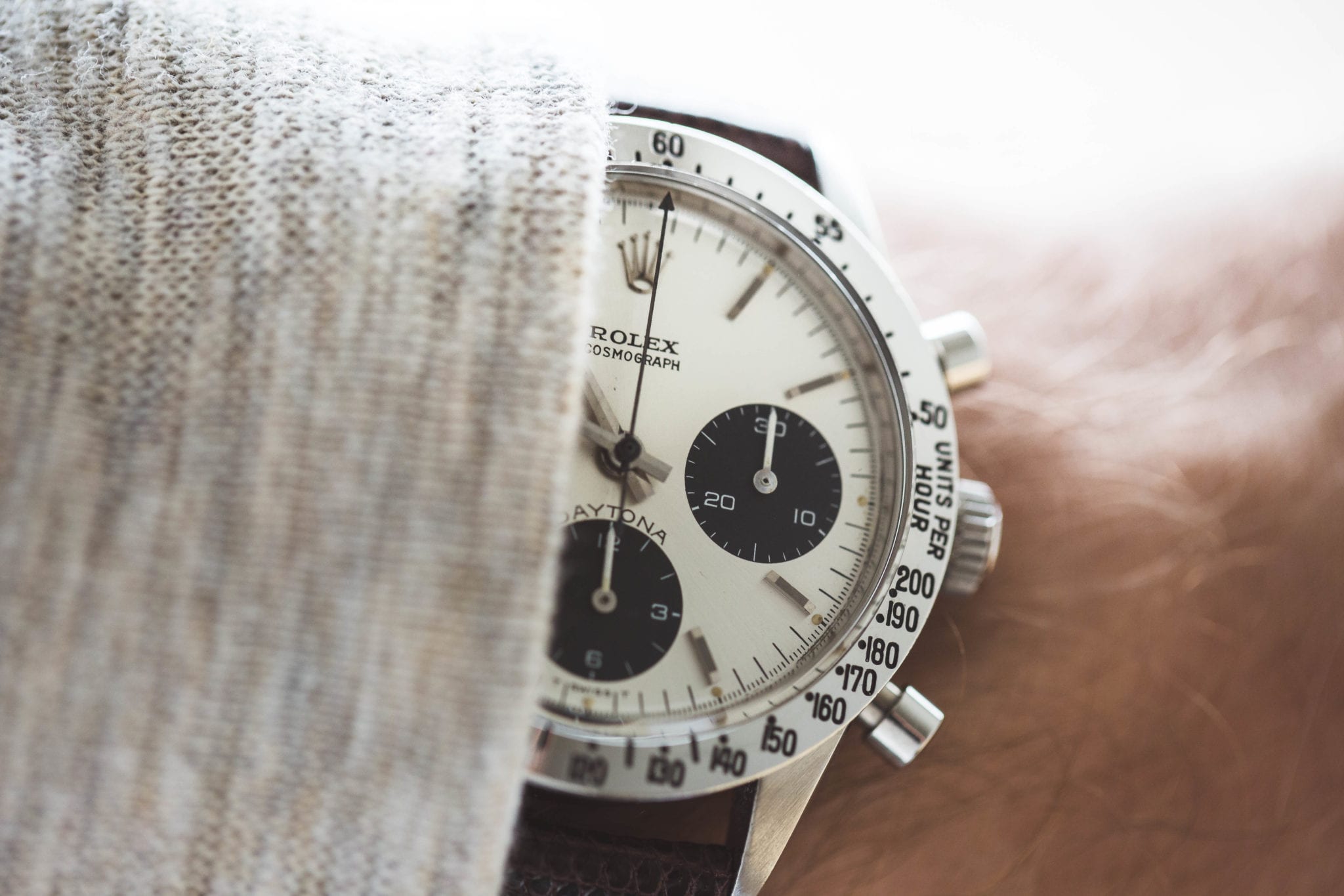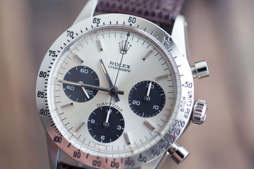 The initial Cosmograph model, Reference 6239, marked a number of firsts for the brand. It was the first model to showcase what’s now considered a panda dial, featuring inverse colors for the chronograph registers. It was also the first model to feature a tachymeter scale engraved on the bezel as opposed to printed on the dial.![]()