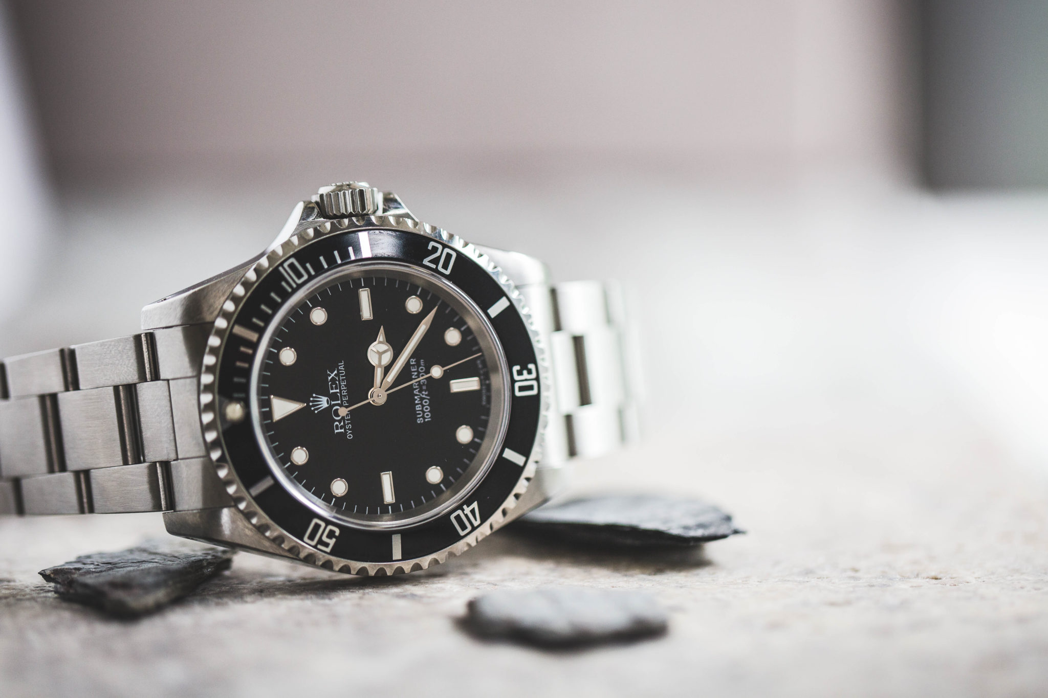 An image of a Rolex Submariner with a black dial and sitting on a piece of marble