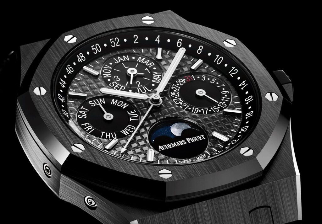 Arguably the most talked-about watch of SIHH 2017 was the black ceramic Audemars Piguet Royal Oak Perpetual Calendar. The watch world has a current love affair with ceramic. One glance at the new Royal Oak’s exterior, and it’s easy to understand the infatuation. A notoriously challenging material to use, Audemars Piguet admits that it takes five times longer to make a ceramic bracelet than it does a steel one. Yet, once finalized, the new Royal Oak has a distinct textured style that is resistant to high temperatures, thermal shocks, and scratching. Pretty impressive.