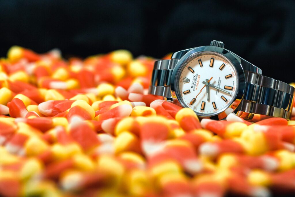 Let’s face it, there’s nothing particularly creepy about the Submariner. It’s just a wicked watch. It also happens to look especially fierce in black, which is, of course, the essential color of All Hallow’s Eve. The Submariner really doesn’t need much introduction. There’s a reason it’s withstood the test of time for over 60 years. It seamlessly integrates the capabilities of a dive watch with a design that’s perfect for everyday wear, even on Halloween.