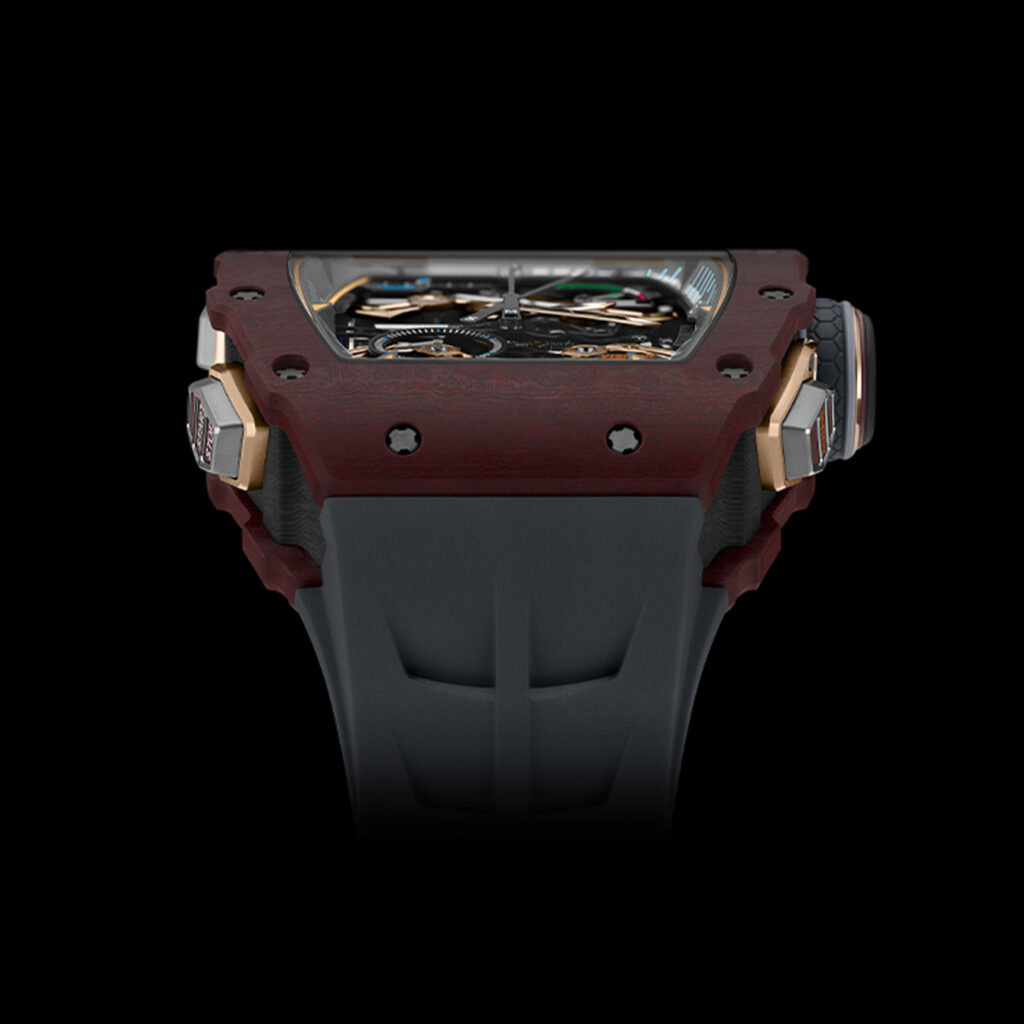 Watchmakers have also embraced that duality. Among luxury and high-end Swiss brands, carbon fiber has become a performance-driven material choice as much as a style-based one. Richard Mille builds cases from layered composites such as Carbon TPT, including the recently released RM 41-01 tourbillon soccer flyback chronograph, which uses Carbon TPT on the caseband. Hublot offers carbon-cased executions within the Big Bang and Spirit of Big Bang lines. Panerai uses its proprietary Carbotech carbon-fiber composite across Submersible and Luminor models. Tudor’s Black Bay Chrono “Carbon 25” features a full carbon-fiber case construction. TAG Heuer has produced Monaco variants engineered with forged carbon cases and components. Zenith manufactures carbon-forward Defy models, including the Defy Extreme Carbon. Ulysse Nardin uses carbon composites, notably Carbonium, in recent sport pieces like the Diver Net OPS / Diver X Skeleton OPS family.