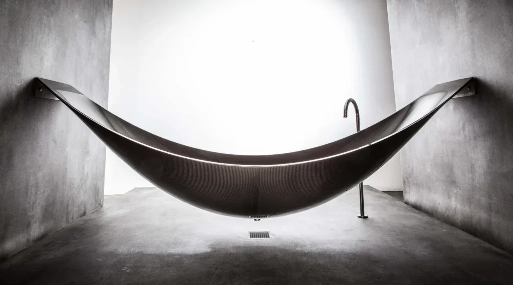 In the U.K., design studio Splinterworks produces Hamaca, a 44 gallon, fully lacquered hammock bath suspended tub priced at $50,000; a piece made possible only because carbon fiber can span such lengths without the bulk of traditional materials. The project began when a Formula One components manufacturer approached the studio about using its facilities during the off-season. The result looks sculptural, almost improbable.