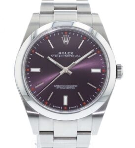 The development of the Oyster case in 1926 was a pivotal moment for Rolex and modern watchmaking. When the Oyster Perpetual collection debuted in 1931, it celebrated this groundbreaking water-resistant system. Rolex models with such a rich history often adhere to the brand’s more traditional design approach. However, over the years, they’ve modernized the collection with additions like this deep purple dial. It’s the perfect hue for fall.