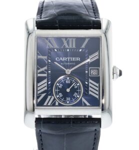 The Tank is undeniably one of Cartier’s most distinctive and iconic watches. In 2013, the classic model got an upgrade with the introduction of the Tank MC, which stands for “Manufacture Cartier.” As the name indicates, it comes equipped with an in-house caliber 1904-OS MC automatic movement. Another striking feature is the guilloche dial, for which Cartier is famous. This blue version with a matching blue leather strap is particularly attractive for fall.