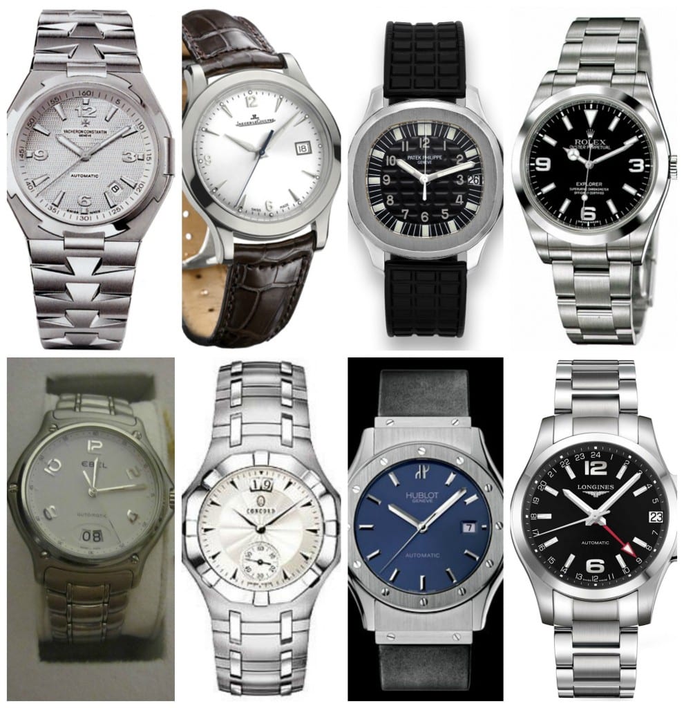 From left to right: Vacheron Constantin Overseas (ref. 47040), Jaeger LeCoultre Master Control (ref. Q1398420), Patek Philippe Aquanaut (ref. 5065), Rolex Explorer (ref. 214270), Ebel Classic Sport (ref. E9125241), Concord Saratoga (ref. 310919), Hublot Classic (ref. 1910.1), Longines Conquest (ref. L3.687.4.56.6)