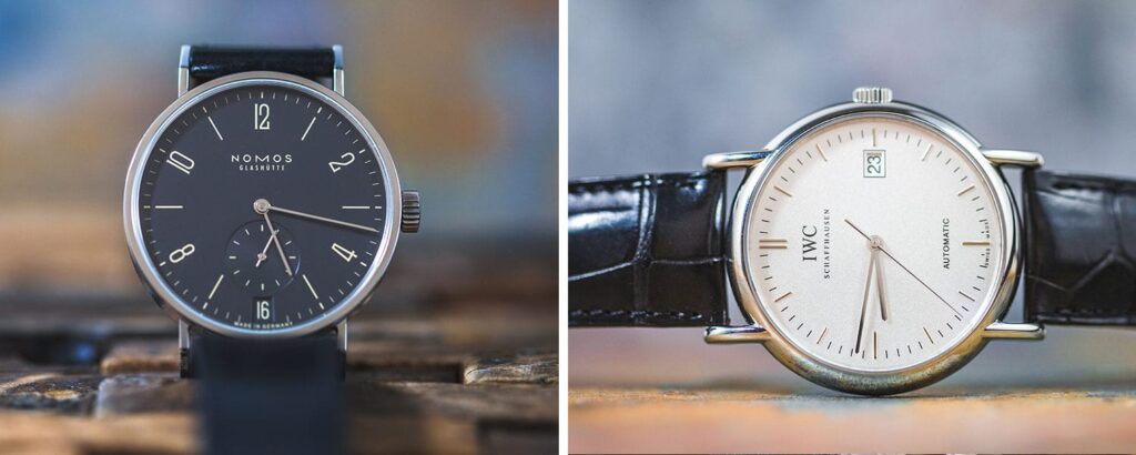 Nomos is a small German brand known for their minimalist and clean designs. This Nomos has a gray dial with a small subdial. Its accenting markers are subtle, yet striking. There is a small date window at the six o’clock position and it comes on a black leather strap. This watch is simple enough to go with a tee, but sleek enough to outfit a suit.