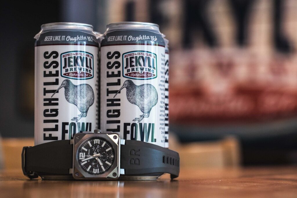 Flightless Fowl is a Juicy IPA. It’s a bit exotic utilizing hops sourced from Australia and New Zealand to give it a strong burst of flavor under its creamy texture. There is also a hint of passionfruit and grape to give it a little something extra. On the can sits a kiwi, a flightless bird native to New Zealand. We paired Flightless Fowl with a pilot’s watch from Bell & Ross – the Aviation Pro Titanium Chronograph. This watch’s square case is distinct, just like the beer, and the colors reflect the can nicely. Plus, it a great watch whether you are in flight or grounded like the kiwi.