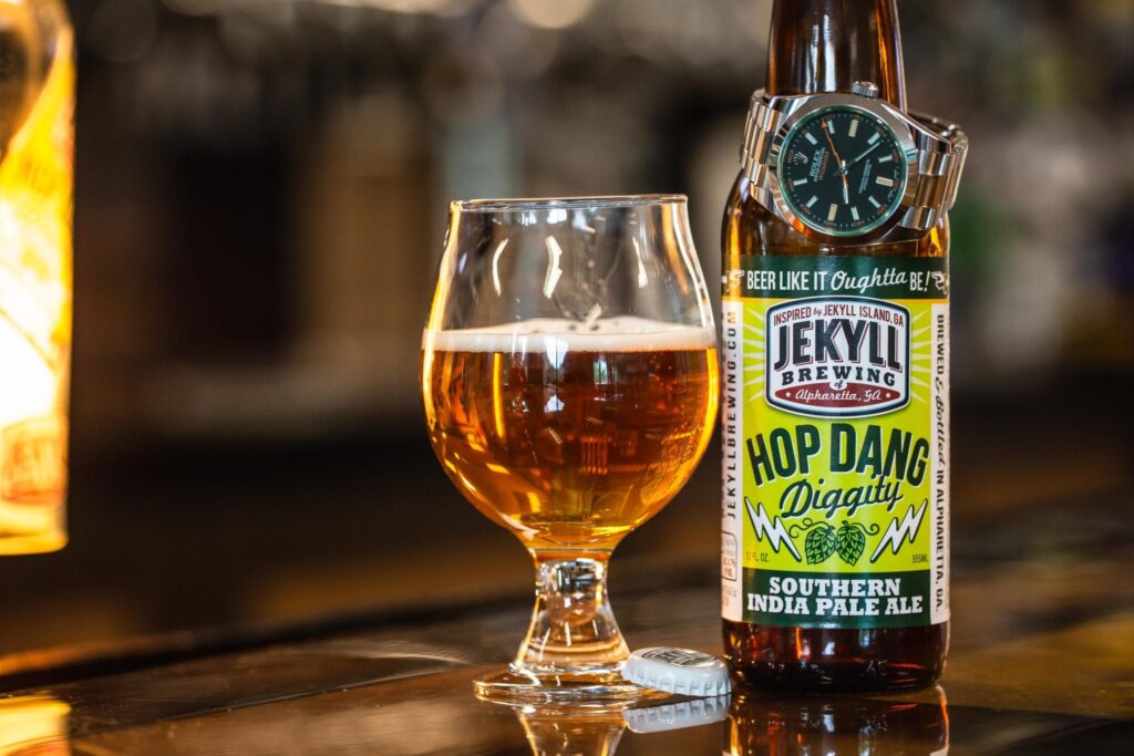 One of Jekyll’s signature beers, and available year-round, Hop Dang Diggity is an IPA that has nodes of Georgia pine, but with a malt foundation. Its two-tone green packaging with silver lightning bolts reminds us of the lush woods, with a southern storm moving in. We paired this with the Rolex Milgauss, a substantial watch, built to withstand a magnetic field of 1000 gauss. The lightning bolts on the can and the dial complement each other nicely, and the signature green crystal on the Milgauss rounds it all out.