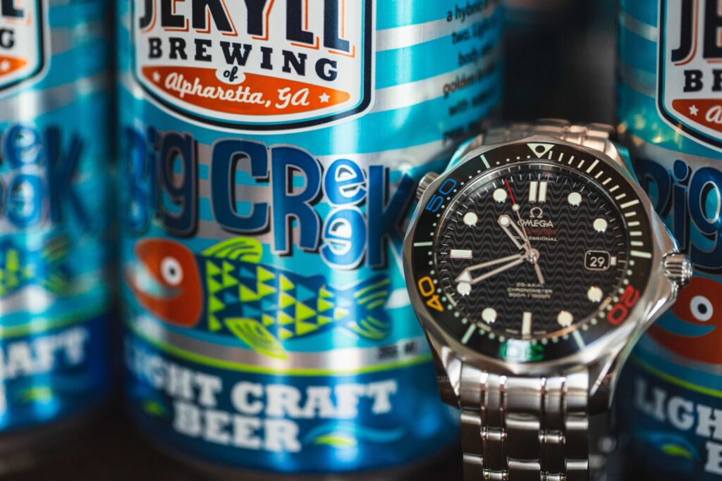 With one of the largest waterways in the south (the Chattahoochee river), there are no shortage of smaller creeks in Georgia. So, Jekyll created Big Creek to honor the creek that meanders near their office. It’s a kolsch-style beer that is not quite a lager and not quite an ale. True to the roots of Kolsch beers, Big creek has a straw-yellow hue and is a great choice for those fall days where the afternoons are still warm. The packaging is a bright and fun, perfect for the OMEGA Seamaster Olympic Edition. Its wave dial and open hands mirror the lines on the can while the different colors on the bezel go well with the jolly fish. This is one dive watch that holds up to both creeks and oceans alike.
