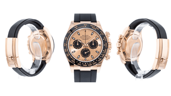 With the debut of Oysterflex, Rolex pushed the boundaries of luxury and functionality even further. It maintained its typical 100 meters of water resistance. For the bezel, they chose a matte black Cerachrom and for the case, Everose. Still the pièce de résistance is the brand new Oysterflex strap.